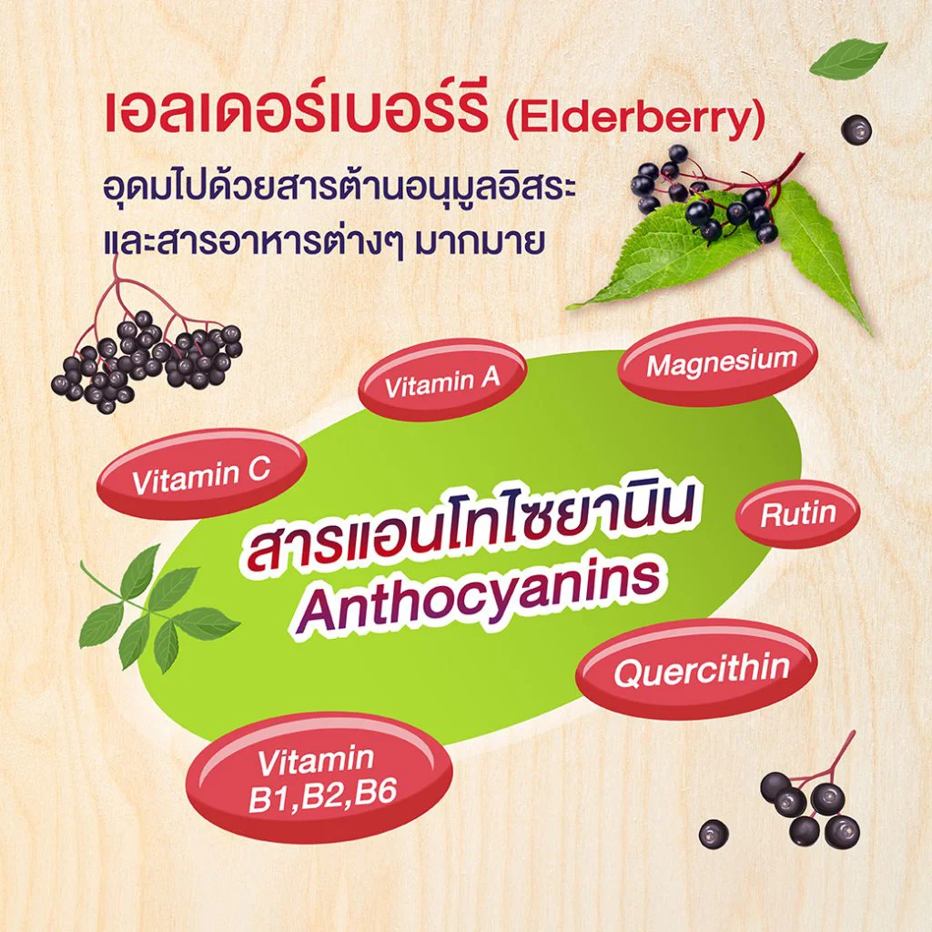 ที่อยู่ในเอลเดอร์เบอร์รี ช่วยยับยั้งการเกาะติดของเชื้อไวรัสกับเซลล์ต่างๆ ในร่างกาย ชะลอการเติบโตของเชื้อไวรัสในระบบทางเดินหายใจ ช่วยในการเสริมสร้าง